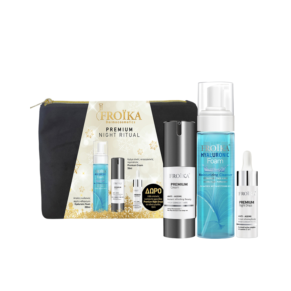 FROIKA Premium Night Ritual sejas kopšanas komplektu veido FROIKA Premium Cream sejas krēms 30 ml un FROIKA Hyaluronic Foam sejas mazgāšanas putas 200 ml. Komplekts paredzēts nobriedušas sejas ādas kopšanai. DĀVANA FROIKA nakts kopšanas eļļa īpašajā 10 ml izmērā un kosmētikas maciņš.