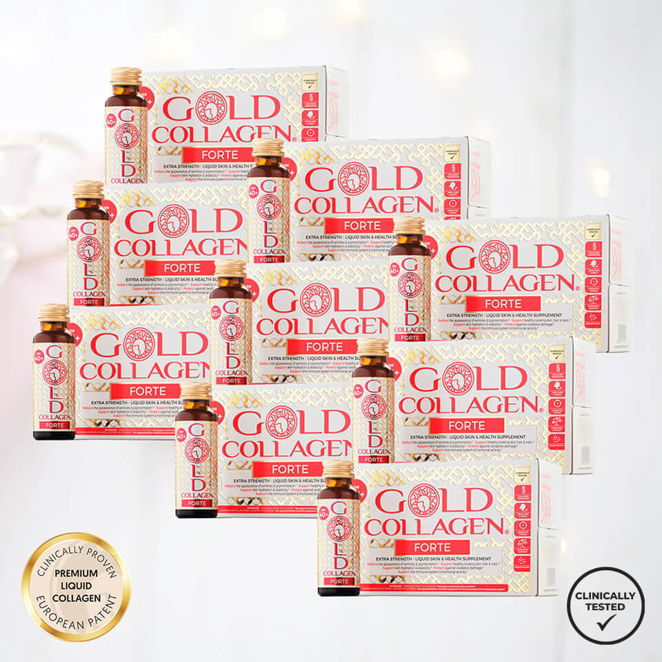 9 kastes Gold Collagen FORTE dzeramā kolagēna (pilns 3 mēnešu kurss) par LABĀKO cenu! Gold Collagen FORTE +40 (dzeramais kolagēns) ādas, matu un nagu veselības uzturēšanai. Gold Collagen FORTE spēj ievērojami uzlabot ādas kvalitāti - nevainojama, jauneklīga izskata āda ir realitāte, ko var sasniegt ar Gold Collagen FORTE. Šīs augstākās kvalitātes dzeramais kolagēns ir paredzēts, lai barotu un atbalstītu jūsu ādu no iekšpuses, tādējādi radot veselīgāku, gaišāku un mirdzošāku sejas krāsu. Gold Collagen FORTE ir piepildīts ar kolagēnu, kas ir ļoti svarīgs ādas elastības un tvirtuma saglabāšanai.