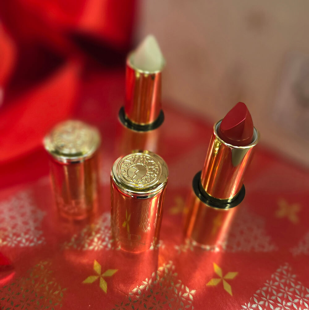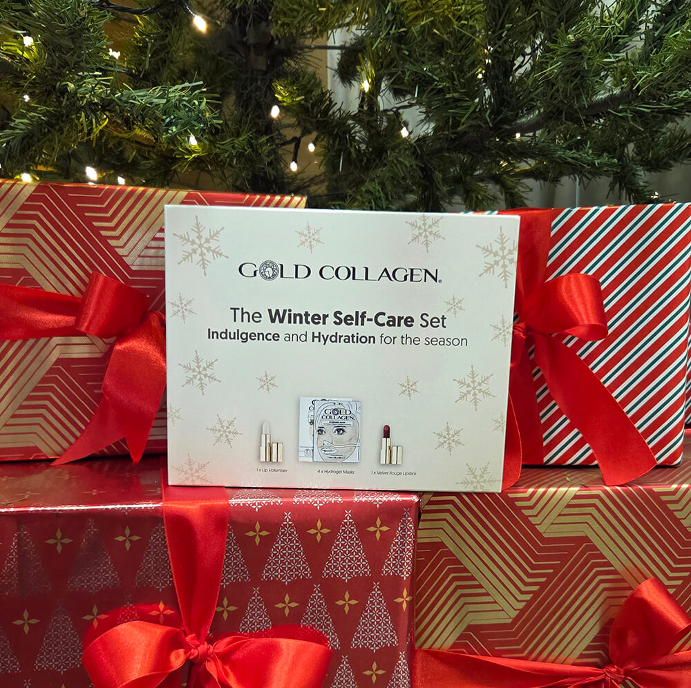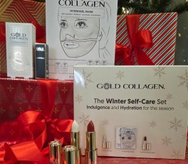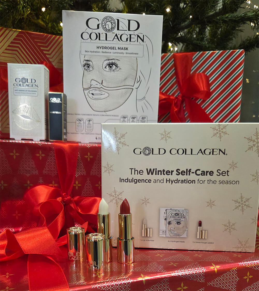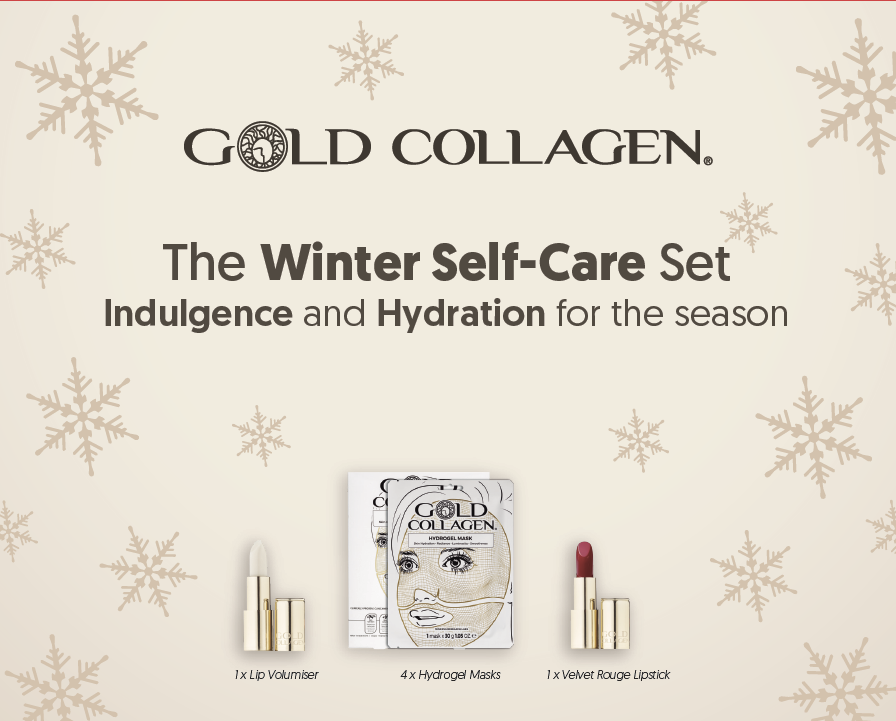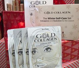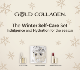 Šis ierobežotā izlaiduma Gold Collagen sejas kopšanas komplekts sastāv no: lūpu balzama + hidrogelu sejas masku iepakojuma (4 maisiņi, katrā pa 1 masai) + Velvet Rogue lūpu krāsas. Visi šie produkti ir iepakoti elegantā kastītē.